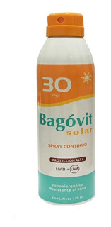 Bagovit solar spray continuo para piel muy sensible a la quemadura solar. La comprobada fotoestabilidad y resistencia al agua de este producto aseguran una adecuada protección contra las radiaciones solares nocivas,evitando ademas el fotoenvejecimiento prematura. Agitar antes de usar , aplique abundantemente en el rostro y en el cuerpo preferentemente 30 minutos antes de la exposición al sol. No contiene benzofenona. Producto testeado dermatologicamente hipoalergenico.